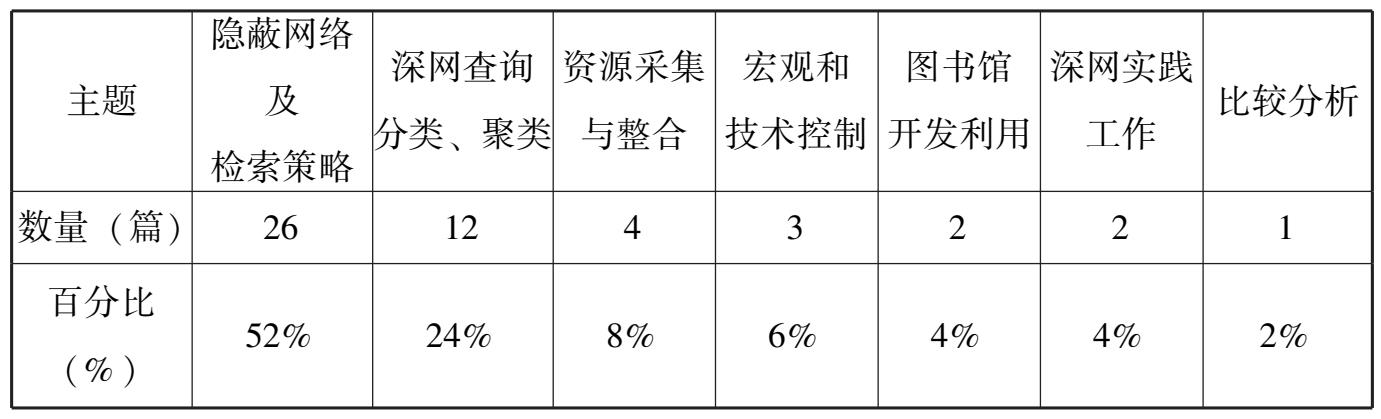 从以上论文分析,我国对隐蔽网络的研究一直偏向于理论介绍,一半以上是阐述隐蔽网络概念、分析其特点和形成原因,提出检索策略。在技术措施方面,图书情报学界很少涉猎,主要是计算机届参与。相对所有主题,隐蔽网络教育的研究、图书馆开发利用研究以及比较分析研究涉入少。