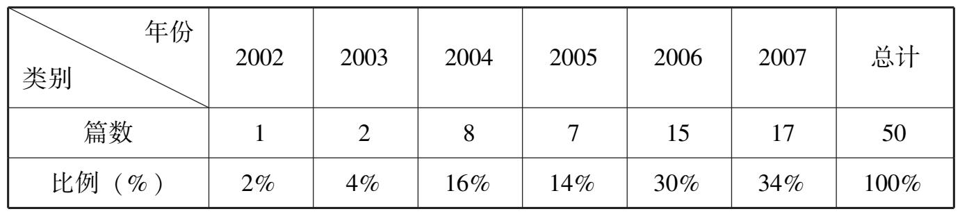 与国外众多的成果形成对照的是,我国国内对隐蔽网的研究起步较晚,2002 年才有人发表此方面文章(以“隐性信息”为关键词),数量也不多,目前国内所发表的有关隐蔽网的文章只有约 50 篇。 Invisible Web资源无论在质量还是数量上,与可见网络相比,均占优势,具有重要的应用价值。在这里分析我国隐蔽网络论文的发表情况,希望能对我国隐蔽网络研究的开展提供参考。