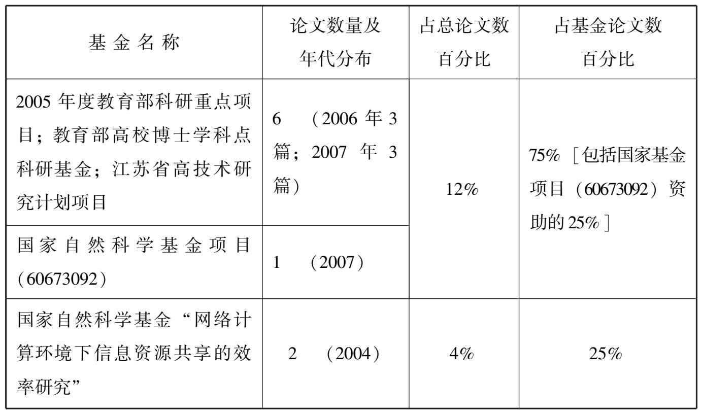 表 14 的数据表明:自 2004 年以来,隐蔽网络研究论文得到 5 项省部级基金支持。因国家自然科学基金项目(60673092)资助的 1 篇论文同时受到教育部科研重点项目、教育部高校博士学科点科研基金和江苏省高技术研究计划项目的资助,故基金资助项目实际上为 8 篇论文。从发文量看,得到基金资助的机构发文量多,其中教育部科研重点项目、教育部高校博士学科点科研基金和江苏省高技术研究计划项目资助的苏州大学智能信息处理及应用研究所的研究论文最多,共 6 篇,占基金论文数的 75%。