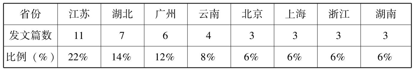 从统计结果看,论文著者遍及全国 14 个省 2 个直辖市,江苏省和湖北省发文数最多,分别占总数的 22%和 14%。发文数最多的江苏省有 11 篇论文,而最少的省只有 1 篇;由此可见该课题研究作者分布范围较广,地区间不均衡,没有形成规模的集中研究区域。