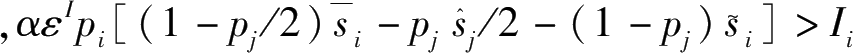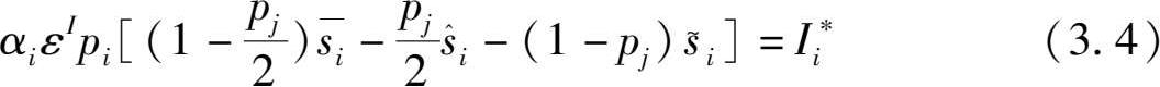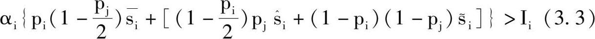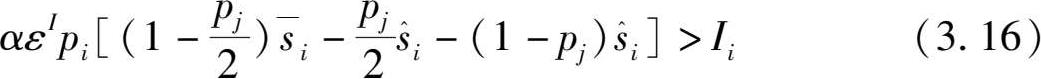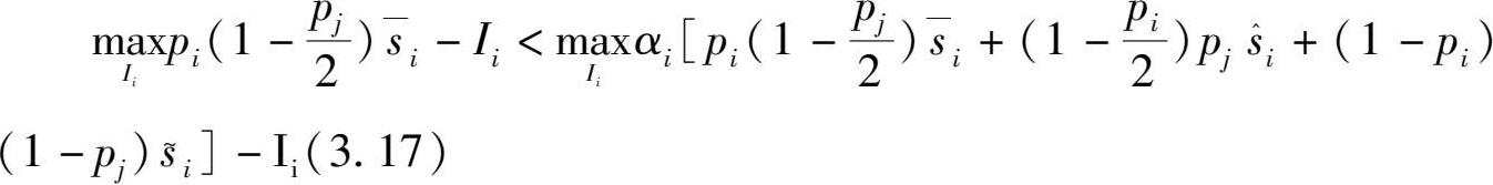 在上面的不等式中,不等号左边是厂商 i 不引进技术所能得到的最大收入,右边是厂商 i 引进技术所能得到的最大收入。(3. 17)式给出了厂商加入技术引进合约的参与约束。当市场中存在多个厂商时,它们中的某一个可能能够与专利所有者签订一种排他性的技术合作合约。当然,为此厂商通常需要补偿专利所有者由于放弃了与其他厂商的合作而遭受的损失。如果某个厂商觉得做出这种补偿后,自身的利润仍然能够有所增长,那么在不考虑其他因素的条件下,这种合约的签订就是合意的。