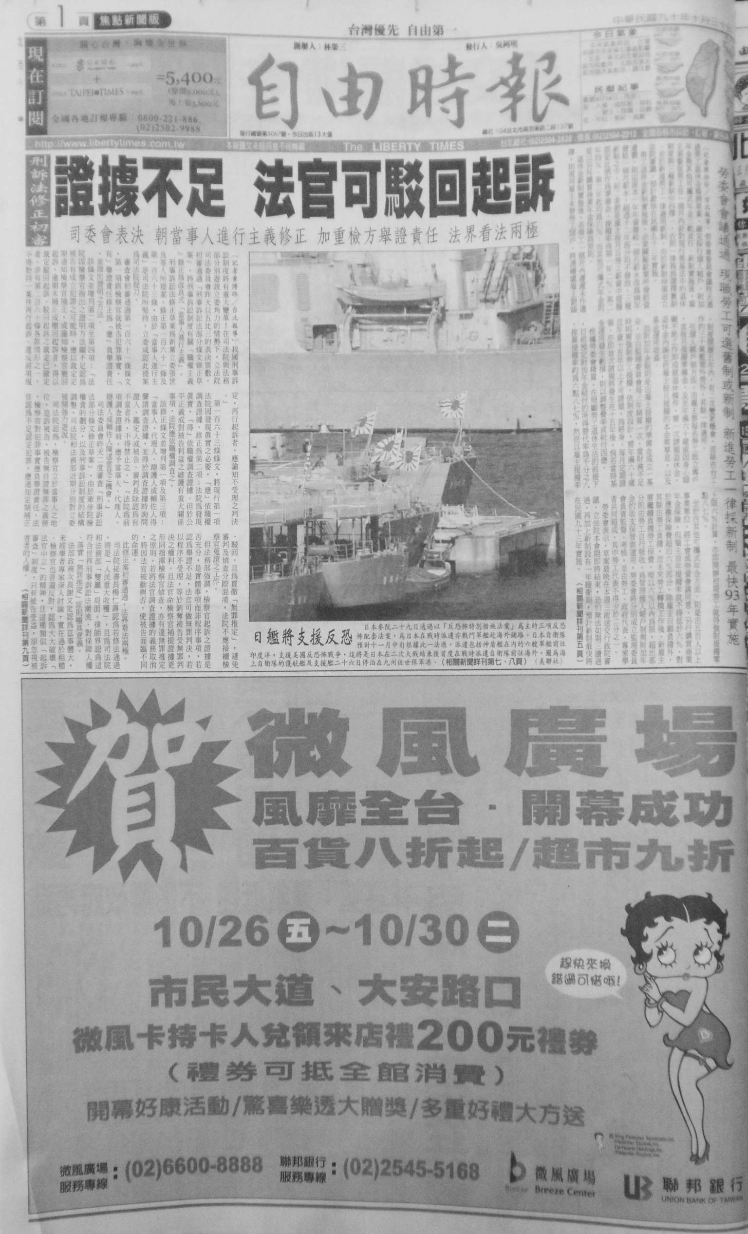 图3-66:头版记为 11(《自由时报》,2001 年 10 月 30 日第 1 版)