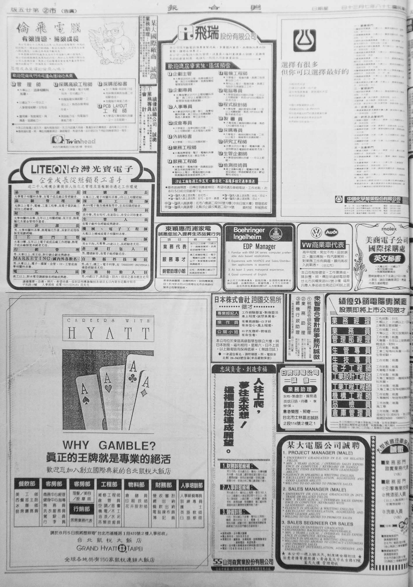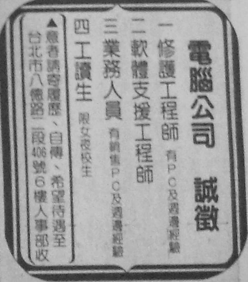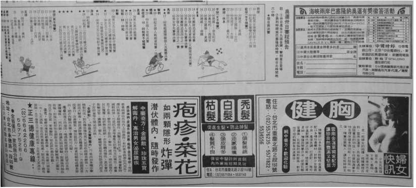 随着网络在台湾的发展,“资讯”一词在广告版名设置中运用的比较多。人事资讯是台湾报纸分类广告的主力军,其实人事资讯就是招聘广告,可见台湾的就业市场变动比较频繁。在统计版面分布时,本文把整版的分类广告也归之为广告版。