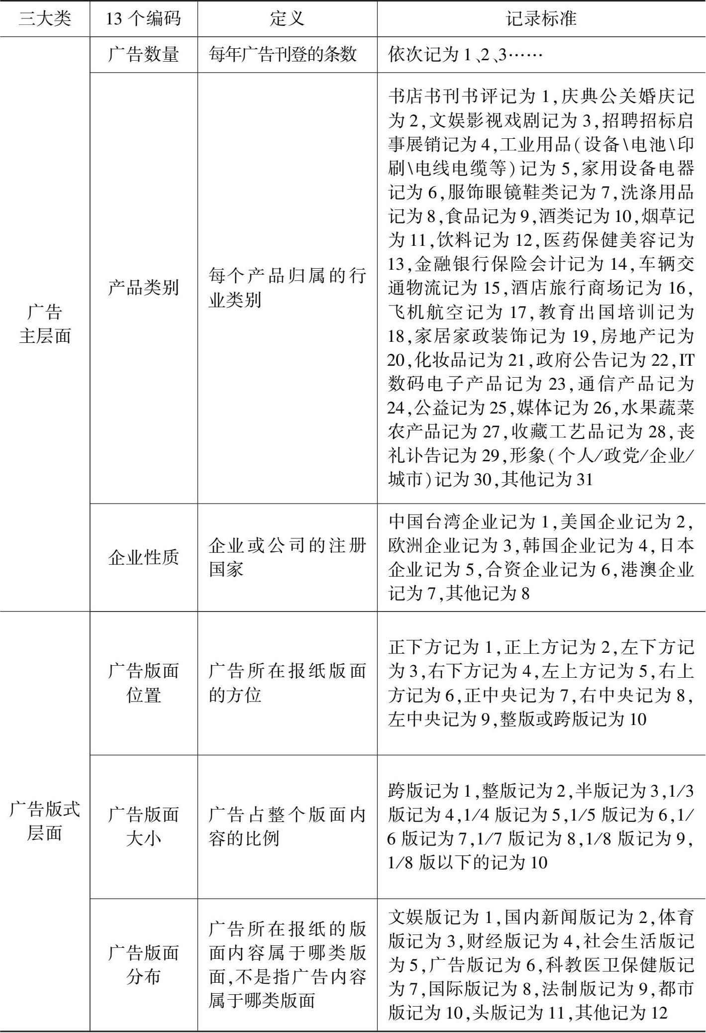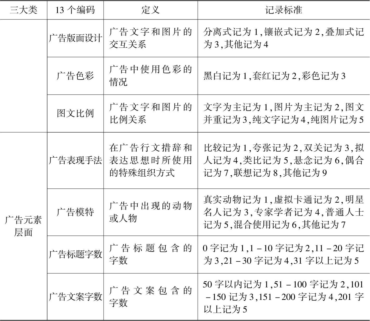 本课题设置的广告表层内容编码分为三大类:广告主层面、广告版式层面和广告元素层面,共 13 个项目(见表 3-1)。