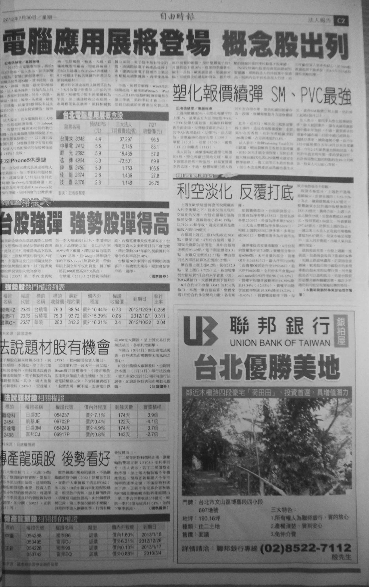 图3-59:财经版记为 4(《自由时报》,2012 年 7 月 30 日C2 版)
