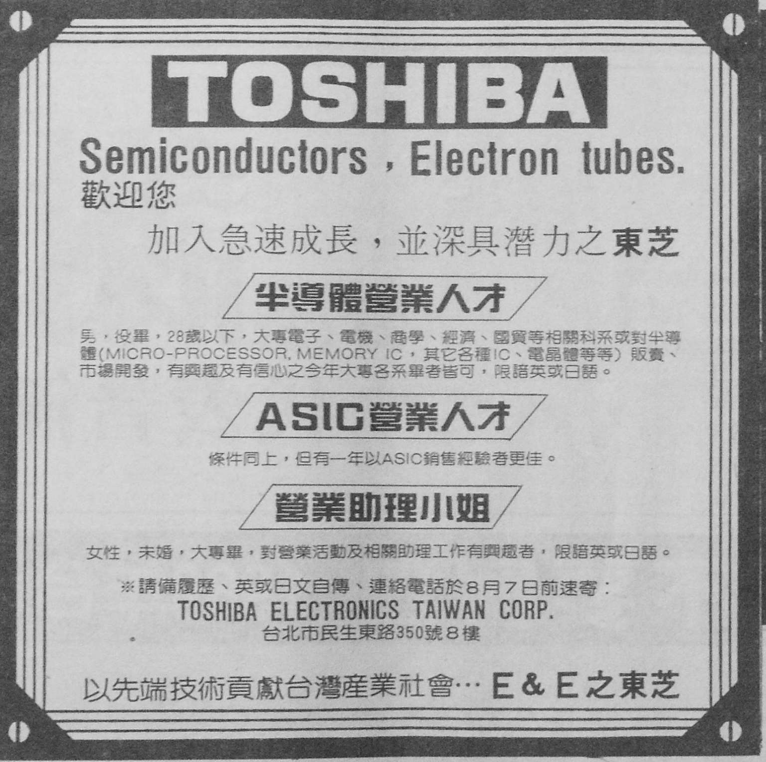 图3-39:日本企业记为 5-东芝招聘(《联合报》,1989 年 7 月 30 日第 30 版)