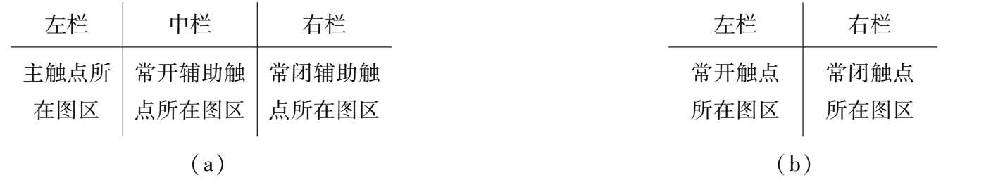 对接触器,上述表示法中各栏的含义如图2.2(a)所示;对继电器的表示方法如图2.2(b)所示。