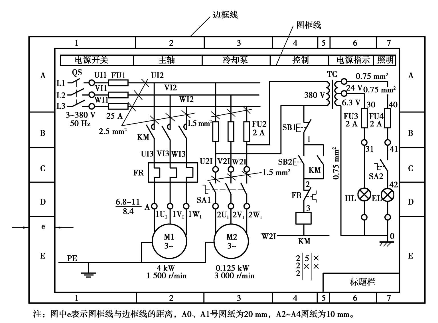 图幅分区的方法:在图的边框处,竖边方向用大写拉丁字母,横边方向用阿拉伯数字,编号顺序应从左上角开始。CW6132 型普通车床的电气原理图如图2.1 所示。