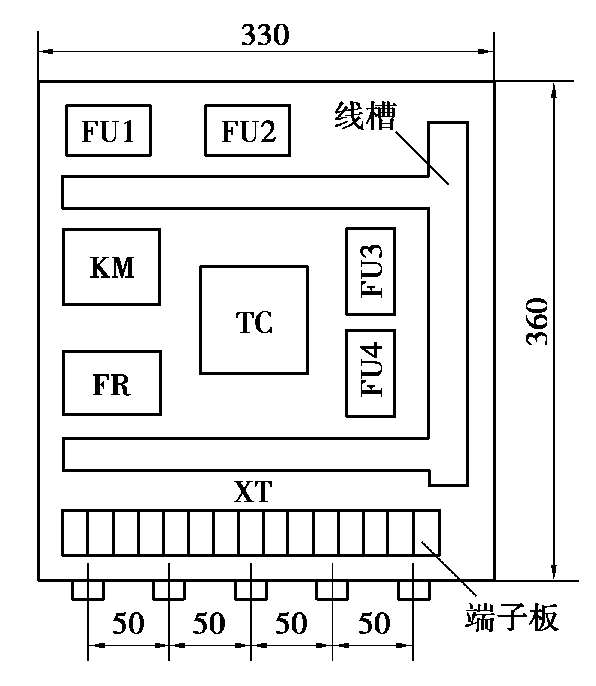 电器元件布置图反映各电器元件的实际安装位置,图中电器元件用实线框表示,而不必按其外形形状画出;在图中往往还留有 10%以上的备用面积及导线管(槽)的位置,以供布线和改进设计时用;在图中还需要标注出必要的尺寸。如图2.2 所示。