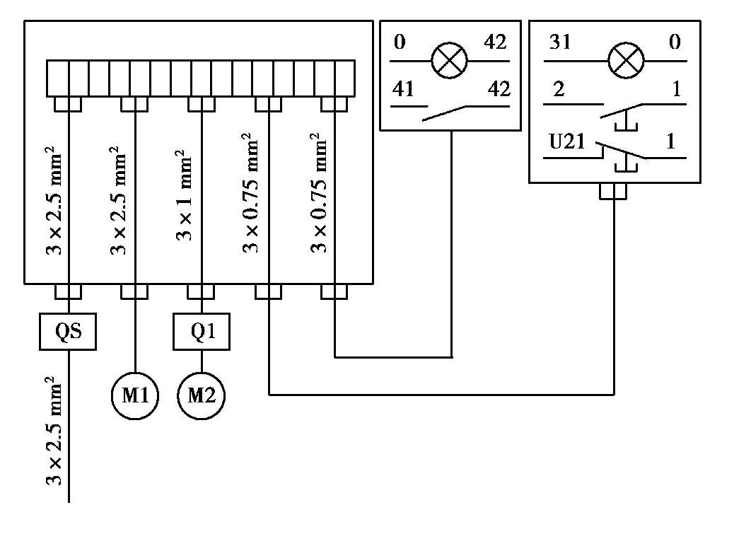 各电动机分支电路各接点标记采用三相文字代号后面加数字来表示,数字中的个位数表示电动机代号,十位数字表示该支路各接点的代号,从上到下按数值大小顺序标记。如U11表示M1 电动机的第一相的第一个接点代号,U21 为第一相的第二个接点代号,依次类推。