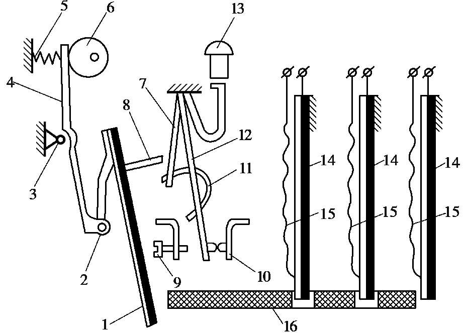 1—补偿双金属片;2—销子;3—支撑;4—杠杆;5—弹簧;6—凸轮;7,12—片簧;8—推杆;9—调节螺钉;10—触点;11—弓簧;13—复位按钮;15—发热元件;16—导板