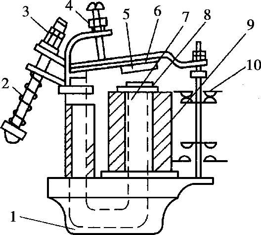 1—底座;2—反力弹簧;3,4—调节螺钉;5—非磁性垫片;6—衔铁;7—铁芯;8—极靴;9—电磁线圈;10—触点系统