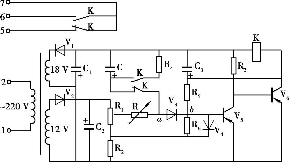 晶体管式时间继电器常用的有阻容式时间继电器,它利用RC电路中电容电压不能跃变,只能按指数规律逐渐变化的原理——电阻尼特性获得延时的。所以,只要改变充电回路的时间常数即可改变延时时间。由于调节电容比调节电阻困难,因此多用调节电阻的方式来改变延时时间。其原理图如图1.32 所示。