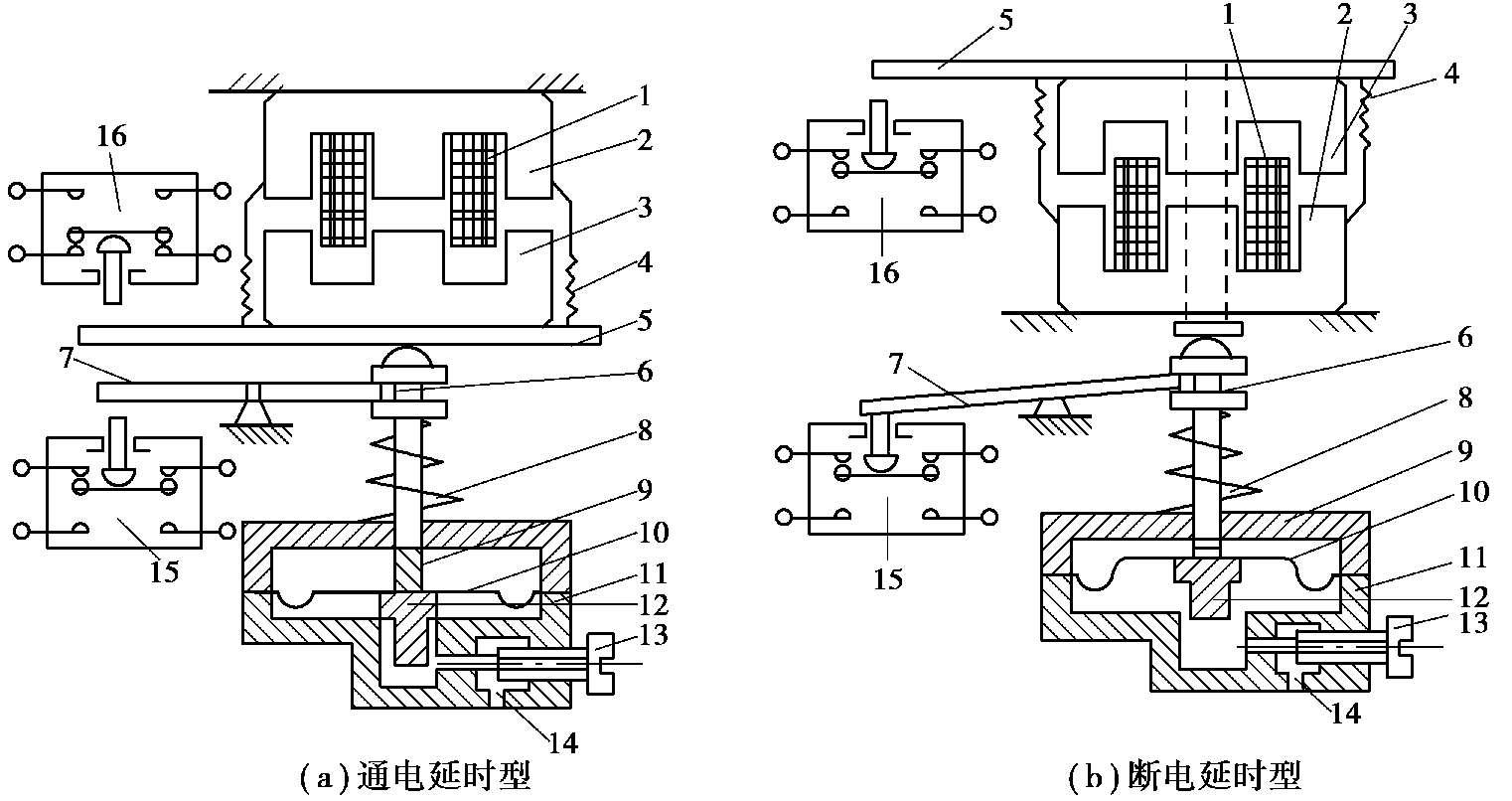 1—线圈;2—铁芯;3—衔铁;4—恢复弹簧;5—推板;6—活塞杆;7—杠杆;8—塔形弹簧;9—弱弹簧;10—橡皮膜;11—气室;12—活塞;13—调节螺钉;14—进气孔;15,16—微动开关