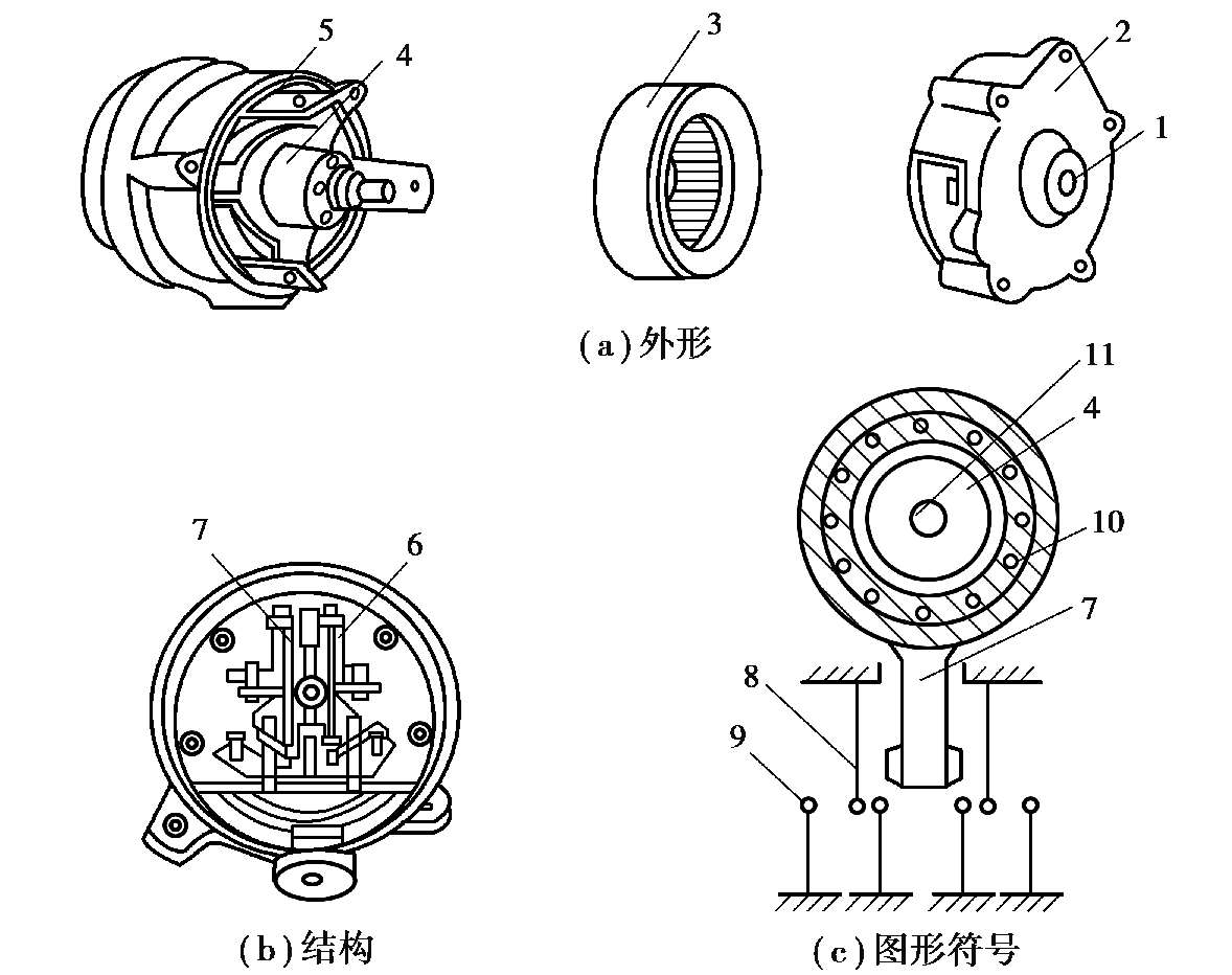 1—连接头;2—端盖;3—定子;4—转子;5—可动支架;6—触点;7—胶木摆杆;8—簧片;9—静触头;10—绕组;11—轴