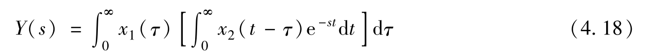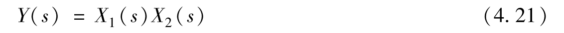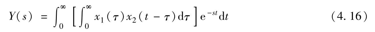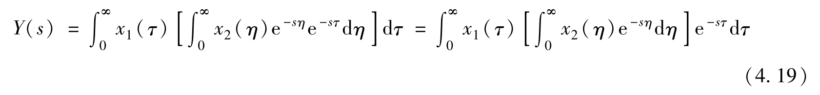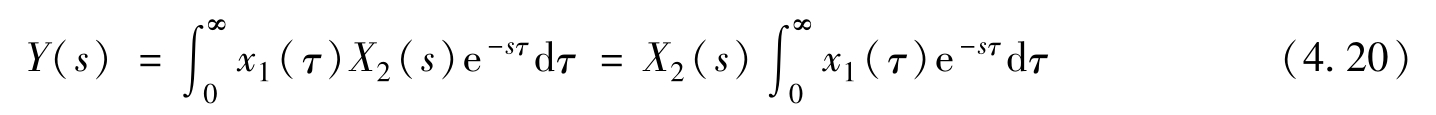 式(4.20)中把 X 2 ( s )提到积分号之前是因为 X 2 ( s )与 τ 无关,而剩下的积分式就是 x 1 ( t )的拉普拉斯变换。所以,式(4.20)就是两个拉普拉斯变换之乘积