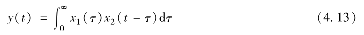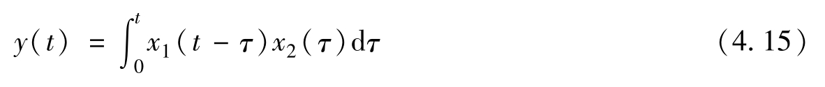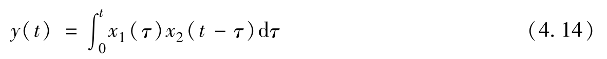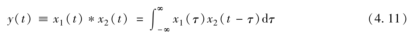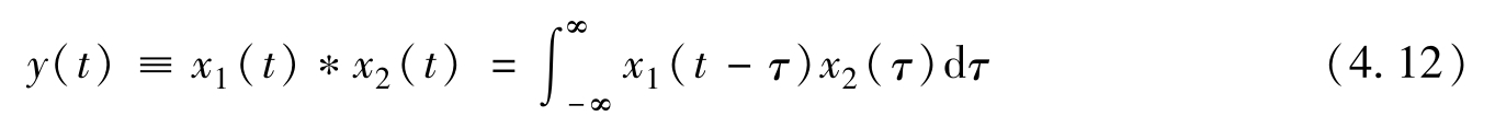 式中,符号“*”表示卷积运算。在上式中,时间变量 t 可看做常量(就像傅里叶变换中的 ω ),而积分变量 τ 在积分完成后随即消失,等式两边只剩下自变量 t 。可以看出,上式与图4.4c是一致的。这是指在式(4.11)和图4.4c中,当计算某个卷积值时, t 是固定的, τ 是变化的,因而 x 1 ( τ )和 x 2 ( t-τ )是反方向行进的。这也就是式(4.11)和图4.4c被叫作卷积的原因。