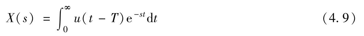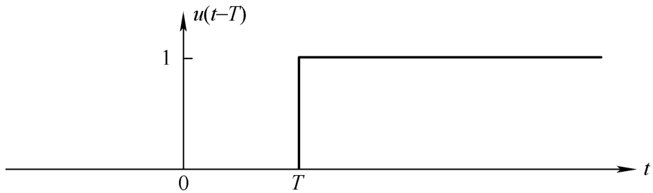 现在把图4.1b中的单位阶跃信号 u ( t )右移时间 T ,变成 u ( t-T ),如图4.3所示。 u ( t-T )的拉普拉斯变换可根据式(4.2)写为