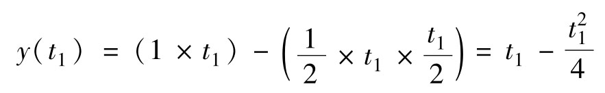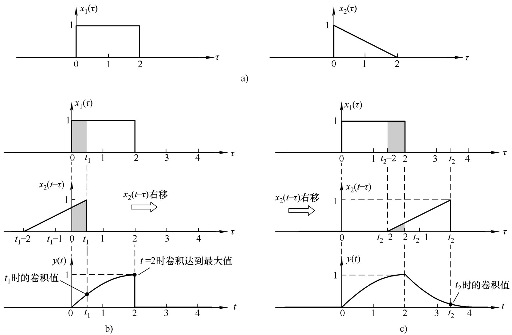 图4.5b表示0≤ t ≤2时的情况。此时, x 1 ( τ )和 x 2 ( t-τ )的重叠面积随 t 的增加而增加,卷积值也随之增加。图中的时间假设为 t = t 1 ,卷积值等于两个阴影部分乘积之积分。由于 x 1 ( τ )恒为1,这个卷积值就等于 x 2 ( t-τ )的阴影面积。这个面积可计算为 x 2 ( t-τ )的高度为1的矩形面积减去上部的倒三角形面积