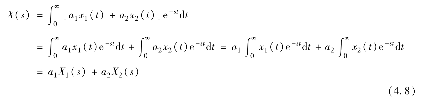 假设用两个常数 a 1 和 a 2 把时域信号 x 1 ( t )和 x 2 ( t )组成线性组合 a 1 x 1 ( t )+ a 2 x 2 ( t )。对这个线性组合,用式(4.2)计算拉普拉斯变换