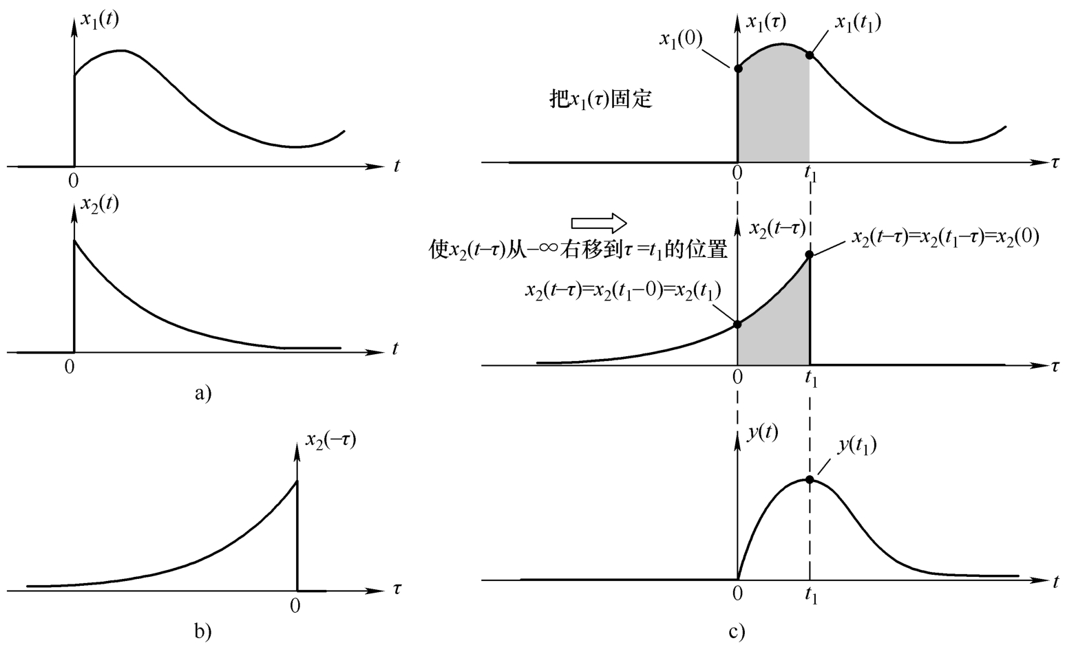 当 τ <0时 x 1 ( τ )恒为零以及当 τ > t 1 时 x 2 ( t 1 -τ )恒为零,所以积分区间被缩小到从0~ t 1 的范围。在此范围内,随着 τ 从0增加到 t 1 , x 1 ( τ )从 x 1 (0)向右变化到 x 1 ( t 1 ),而 x 2 ( t 1 -τ )从 x 2 ( t 1 )向右变化到 x 2 (0)。所以,对图4.4c中两个阴影部分之间的乘积做积分,就得到 t = t 1 时的卷积值。图4.4c下面的小圆点就表示此时的卷积值 y ( t 1 )。