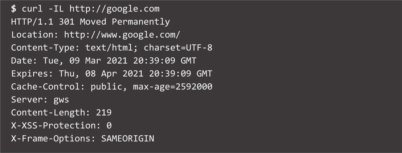 这条命令执行后会访问网站www.google.com,并在执行命令的参数中使用-I以显示HTTP响应的头部信息。添加-L参数是为了自动重定向命令执行过程中的所有HTTP请求。
