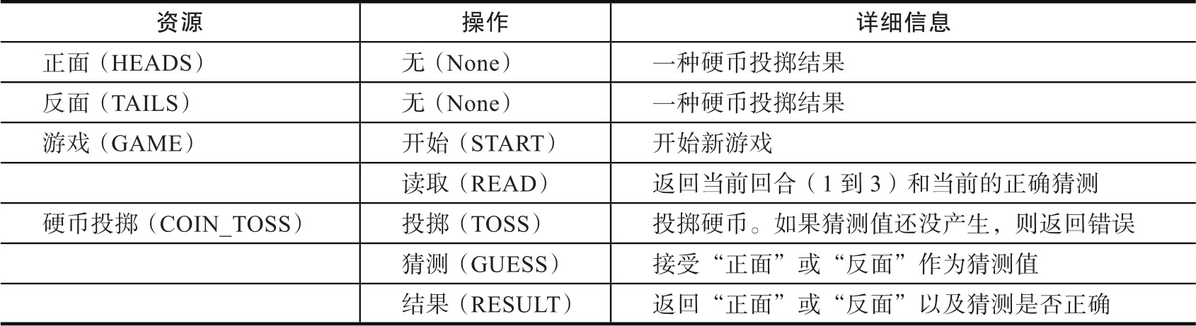请注意,每个资源都有一套自己的可执行的操作。如果需要的话,操作可以重复,但并非必需。资源可以被组合成一个层次结构的形式(比如本例中,COIN_TOSS依赖于更高层次的GAME资源)。操作可以要求带参数,这些参数可以是其他资源。