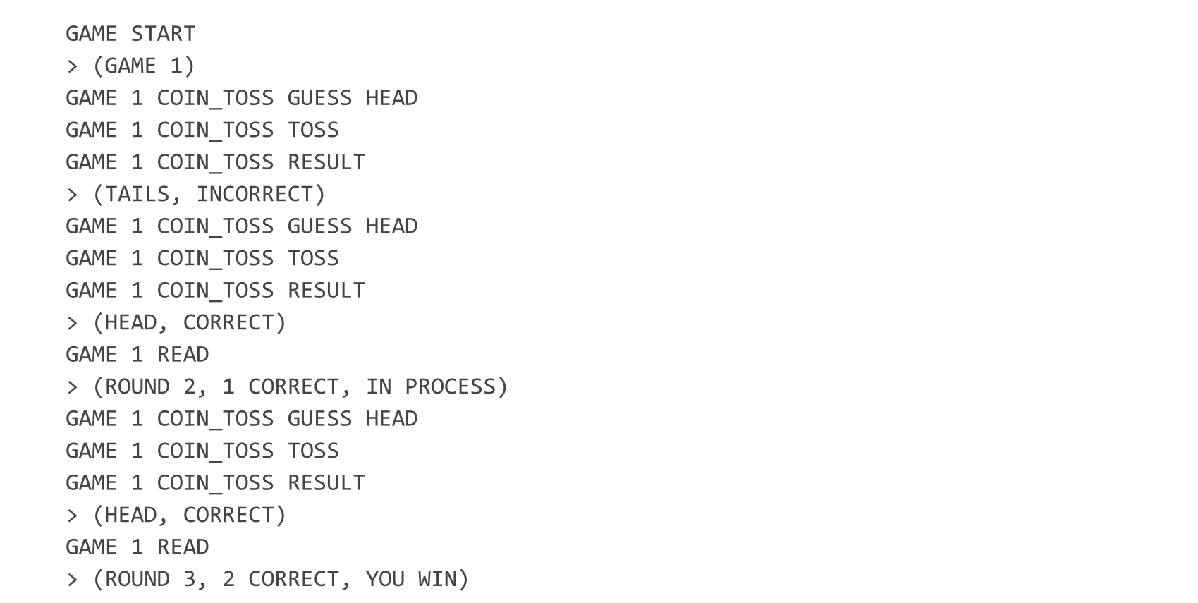 例如,让我们设计一个非常简单的接口,用来玩一个简单的猜硬币游戏。这是一个猜三次硬币投掷结果的游戏,如果猜中两次及以上,则用户获胜。