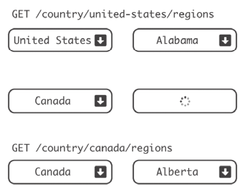 例如,有个输入地址的表单,可以用下拉菜单选择国家。在选择某个国家之后,通过对服务器的调用将检索出该国家所对应的地区,并更新输入选项菜单。例如,如果用户选择美国,则美国所有州的列表将被检索出来,并填入界面上的下拉菜单中供选择;如果用户选择加拿大,则将使用地区和省的列表来代替,如图2-6所示。