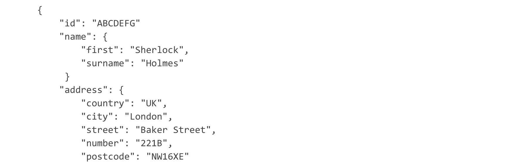 因此,在这个例子中,我们可以检索键(ID)ABCDEFG,就像在键值存储型数据库中一样,或者执行更复杂的查询,例如“在 detectives (侦探)集合中获取所有address.country等于UK的条目”。
