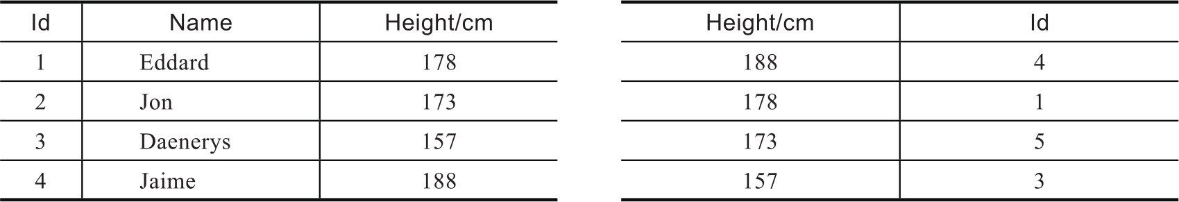 因为索引表始终保持有序,所以执行任何与高度有关的查询都很容易。例如,要获取前三名的高度,现在不需要做任何Height字段比对操作,只需从索引表中检索前三条记录。要确定180和170之间的高度也很容易,只需到排好序的列表中的对应位置搜索即可,像二进制搜索一样快。再次强调,如果这个索引表不存在,那么找到这些所需数据的唯一方法是检查原始表中的每一条记录。