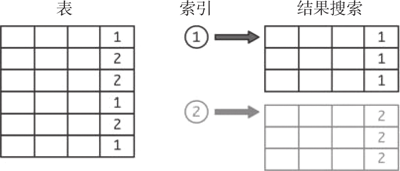 现在假设该字段有两种值。此时索引会先返回表中一半的记录,然后在这些记录中检索,如图3-12所示。这样效果要好一点,但是与直接进行全表扫描相比,使用索引需要一定的开销,所以在实践中,这种优势并不明显。