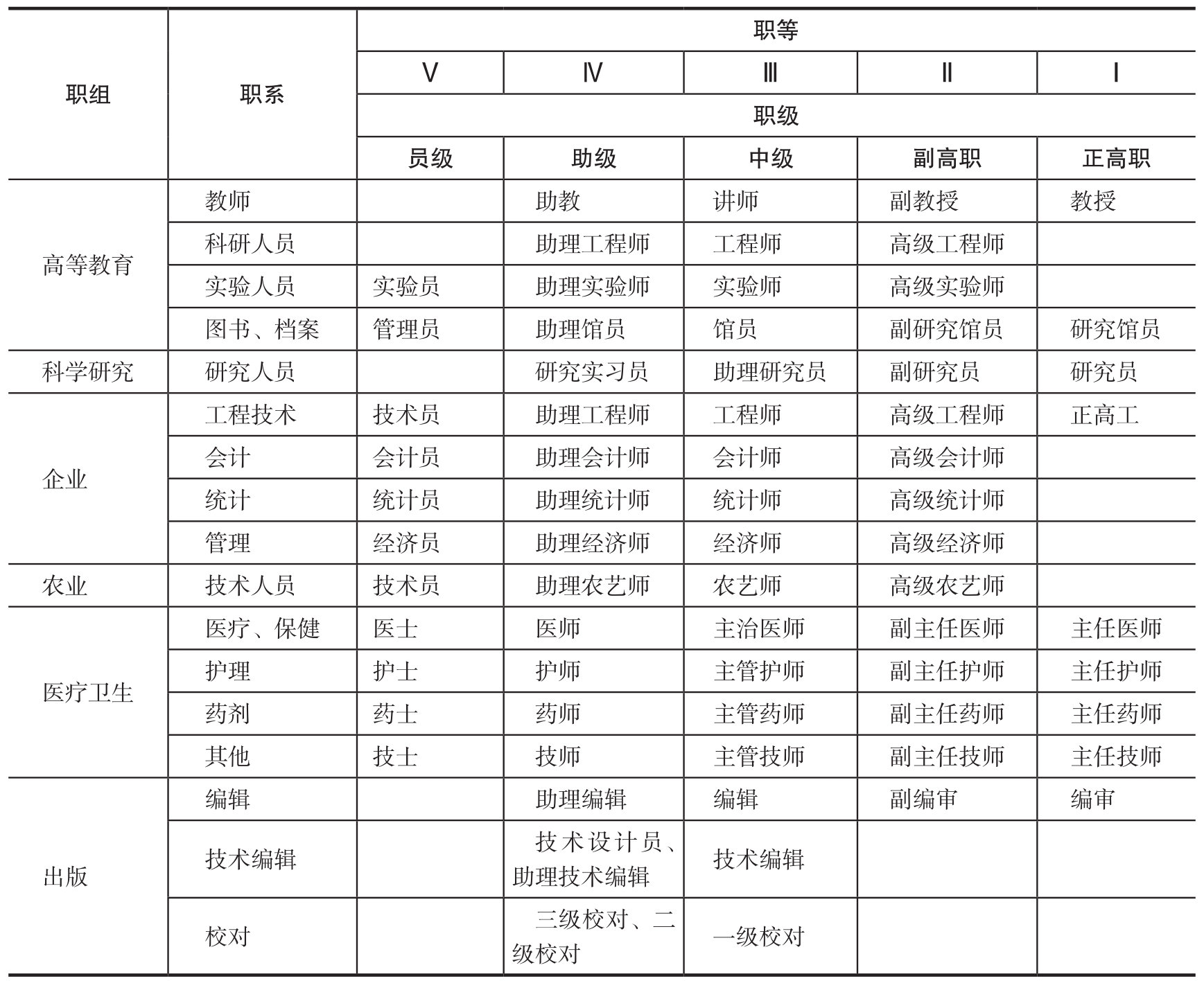 联系、职组、职级与职等:职系是指一些工作性质相同,而责任轻重和困难程度不同的职位系列,也叫职种。简言之,一个职系就是一种专门职业。职组是指工作性质相近的若干职系的总和,也叫职群。职级是指工作内容、难易程度、责任大小、所需资格皆很相似的职位的分类总称,俗称职称。一般来说,同一职级实行同样的管理与报酬。职等是工作性质不同或主要职务不同,难易程度、职责大小、工作所需资格等条件充分相同的职级总称。表3-1为我国部分专业技术职务的简表,从中我们可以了解职组、职系、职级、职等之间的关系。
