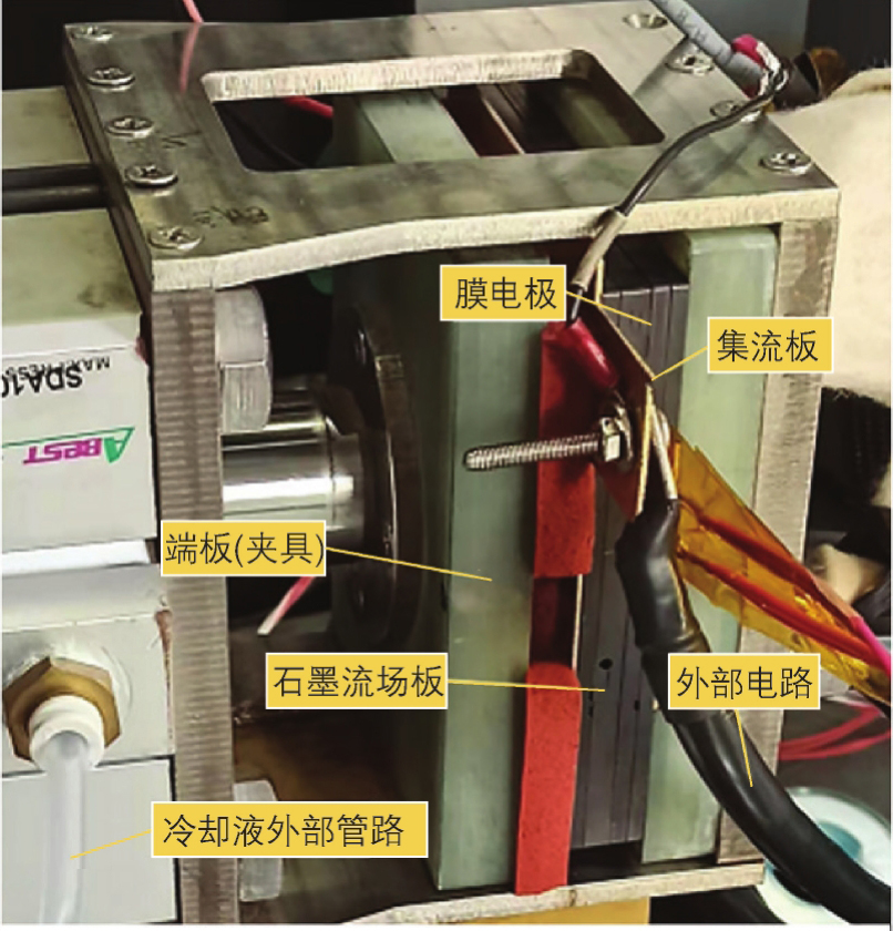 通过上述原理分析可以发现,燃料电池正常工作时,电池内部涉及反应气体输运、电极反应、电子和质子传导、产物水排出及产热散热等物理化学过程。PEMFC结构不仅要实现上述各过程,且需要使性能、成本、耐久性等综合性能达到最优。由一片PEMFC组成的电池称为单电池,图2-1为实验室通过夹具组装好的单电池实物图,实际装车的PEMFC电堆由多片燃料电池堆叠串联而成。