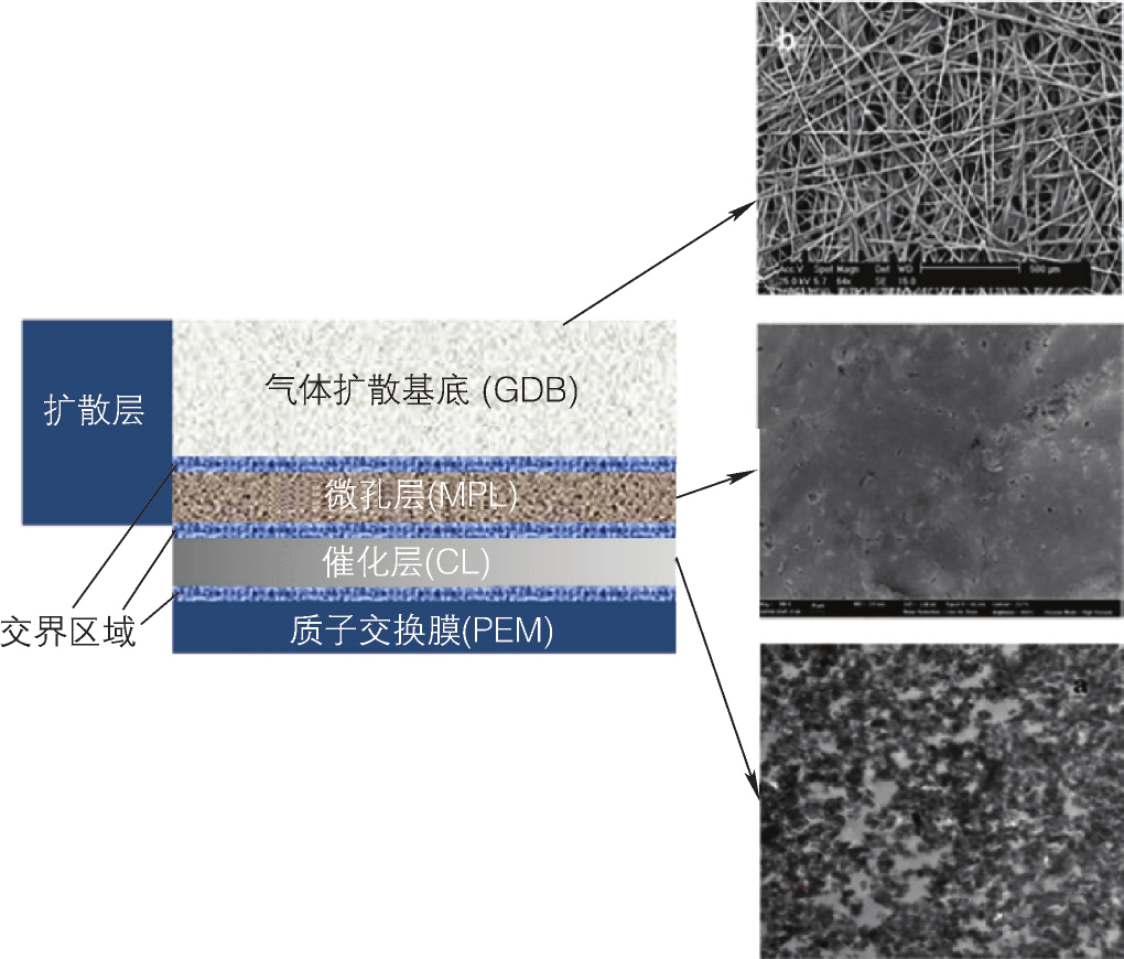 每个单侧电极都包括气体扩散基底(GDB)、微孔层(MPL)和催化层(CL)。此外,在各层相交处存在交界区域,结构如图2-2所示,各层简介如下: