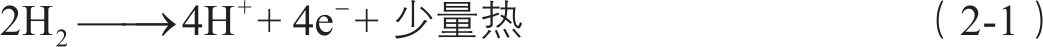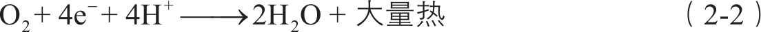 氢燃料电池的发电原理可以简单概括为氧气和氢气发生电化学反应生成水,反应过程中将储存在氢中的化学能转化为电能,同时释放热量。氢氧反应被拆分为两个半电极反应,见式(2-1)和式(2-2)。