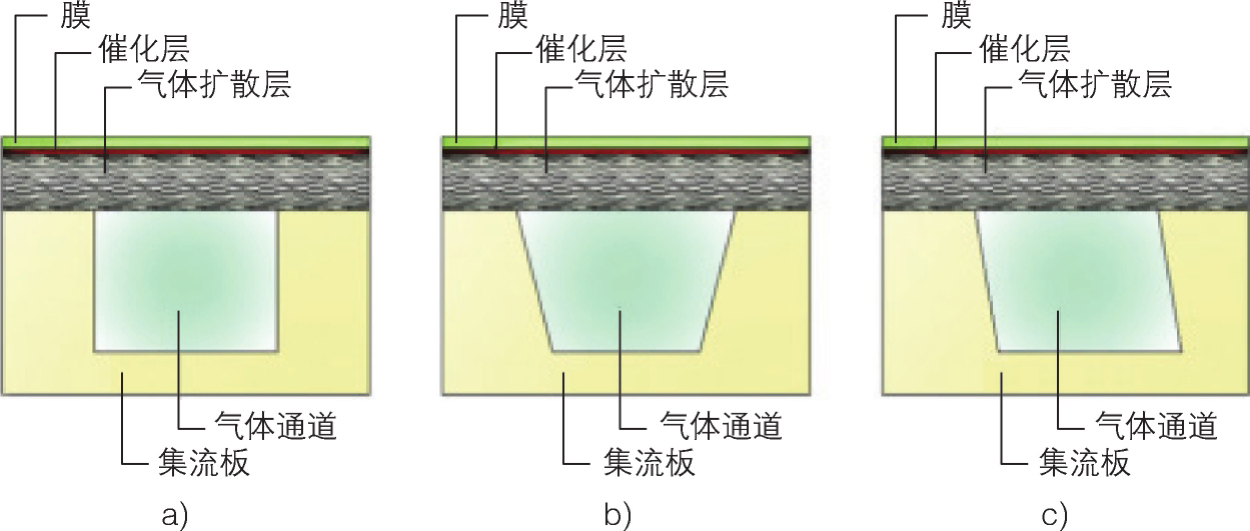 关于通道的横截面形状,矩形横截面是通道最广泛使用的配置。Kumar等 [80] 分析了通道尺寸对阳极耗氢量的影响。对于高氢消耗量(80%),通道宽度、脊宽度和通道深度的最佳尺寸值分别接近1.5mm、0.5mm和1.5mm。此外,研究了不同通道形状的影响。结果表明,三角形和半圆形横截面导致阳极的氢气消耗量增加约9%,从而提高了燃料电池的效率。Ahmed等 [81] 研究了三种不同的通道横截面:矩形、梯形和平行四边形,如图2-22所示,在高电流密度下,脊宽度对电池性能有重要的影响。较窄的脊宽度有利于反应物的分布并有助于减少浓度损失。