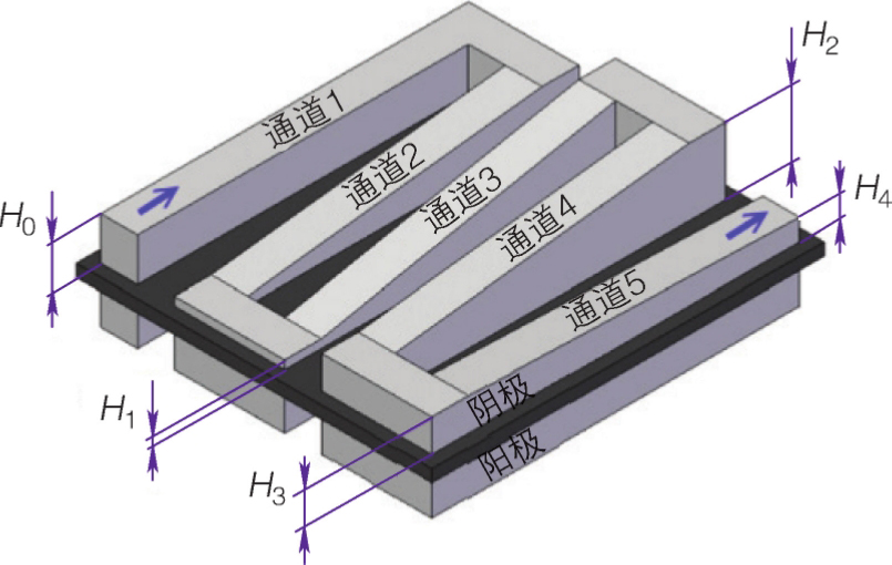 通过改变通道高度,提出了一种针对单个蛇形燃料电池的优化方法,该模型具有5个通道,有效面积为81mm 2 ,如图2-24所示。该几何变量仅应用于阴极,保持与阳极流道略微相似以保持恒定的通道截面。优化的几何结构使得电池输出功率比具有直通道的电池增加11.9倍。最佳模型由三个锥形通道(通道2~4)和一个最终发散通道(通道5)组成。通道截面变窄改善了主通道流动和副脊对流,两者都增加了局部氧气传输速率,从而提高了局部电流密度。