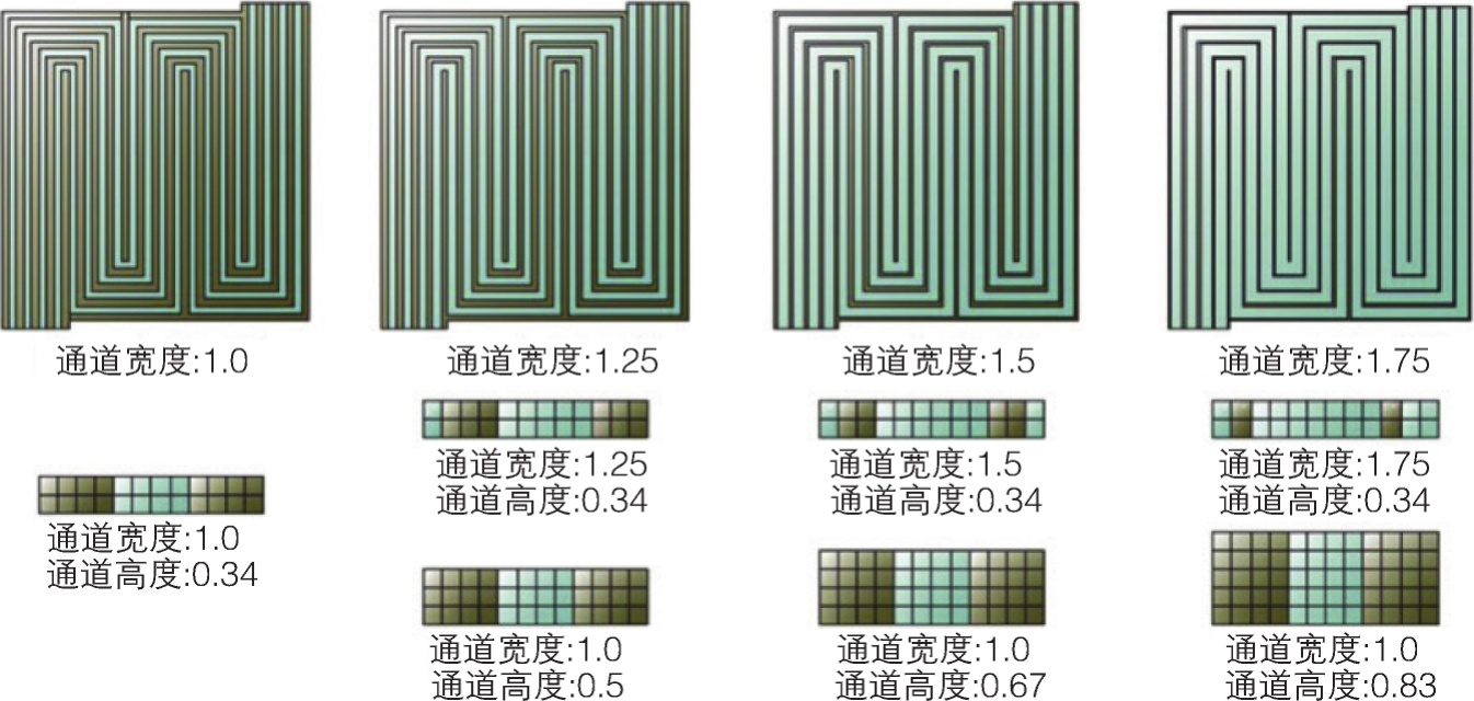 图2-25 7个具有不同通道宽度(mm)和高度(mm)的流场