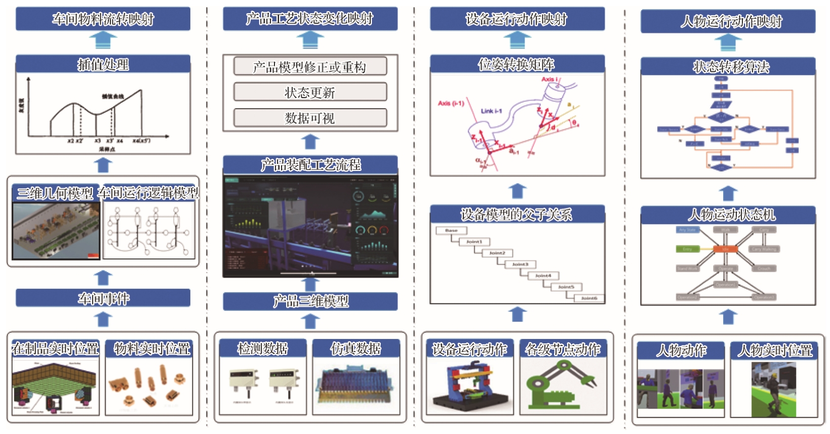 基于Sim3D视景仿真图形渲染引擎,通过3D车间可视化与UI数据可视化对车间要素进行建模和场景布置,在此基础上建立融合数据与数字孪生模型间的映射关系,从二维全要素和全业务运行状态、三维全过程两个方面综合反映复杂离散制造车间的运行情况,实现对物理车间的可视化同步运行和全局监控。二维全要素和全业务运行状态监控主要通过建立车间多层级电子监控看板来实现,其在实时数据的驱动下更新相关数据及统计信息和预测信息,如任务进度信息、物料使用情况、工序完成情况、环境状态等实时状态;瓶颈资源、预计完工时间、关键质量特性预测值等预测信息。三维全过程监控,主要是基于所构建的车间数字孪生体模型,分别针对车间物料流转、产品工艺状态变化、设备运行和人物动作等进行虚实同步映射,实现对车间运行过程的数字化镜像,如图3.15所示。