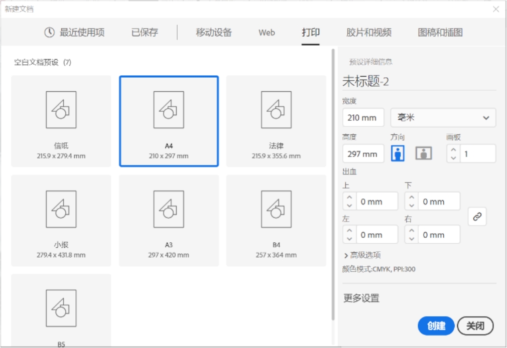 ● 图稿和插图:单击此按钮,会在其下方显示15种常用的用于设计的文档尺寸。