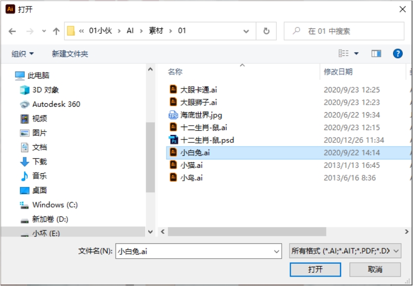 使用“打开”命令可以将存储的文件,或者可以用于该软件的图片在软件中打开。选择“文件”>“打开”菜单命令或按【Ctrl+O】组合键,打开如图1-12所示的“打开”对话框,在该对话框中可以选择需要打开的AI文档素材。