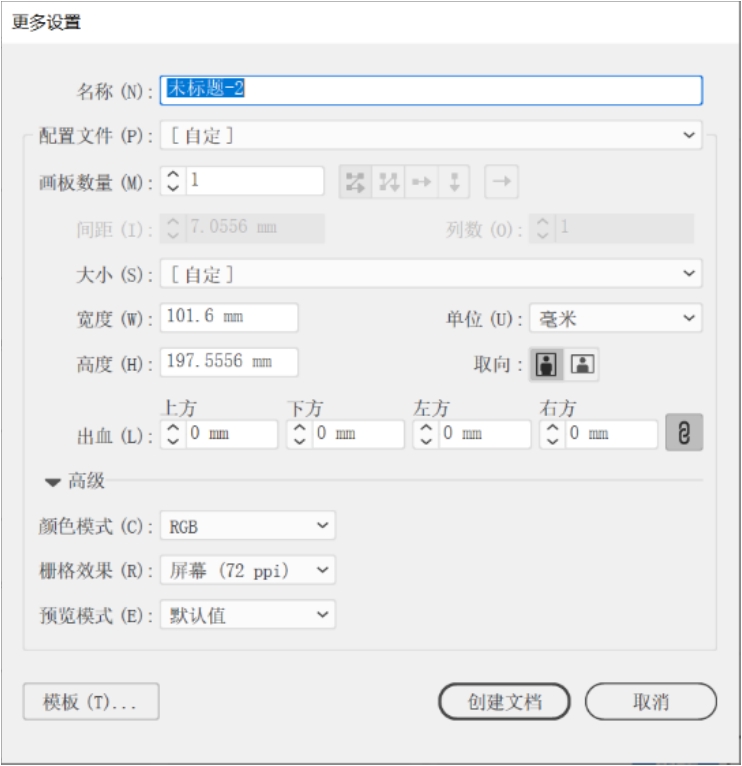 ● 宽度/高度:用来设置新建文档的宽度与高度。