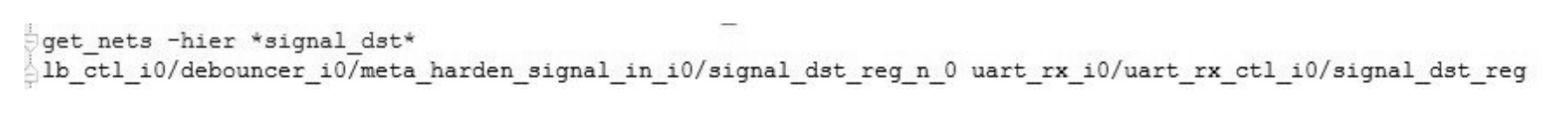 此外,观察uart_rx下的模块meta_harden,其综合结果如图2.5所示。可以看到,meta_harden内部的signal_dst是一个同步复位D触发器。当-flatten_hierarchy为none时,signal_dst端口名保持不变;而当-flatten_hierarchy为rebuilt时,则在原有端口名称后添加_reg作为后缀。这也是Vivado对寄存器命名的一个特征,理解这个特征便于寻找网线(net)。当-flatten_hierarchy为full时,利用get_pins命令则无法找到该引脚,利用get_nets命令尽管可以找到类似名称的网线,但并非uart_rx模块下的网线,如图2.6所示。