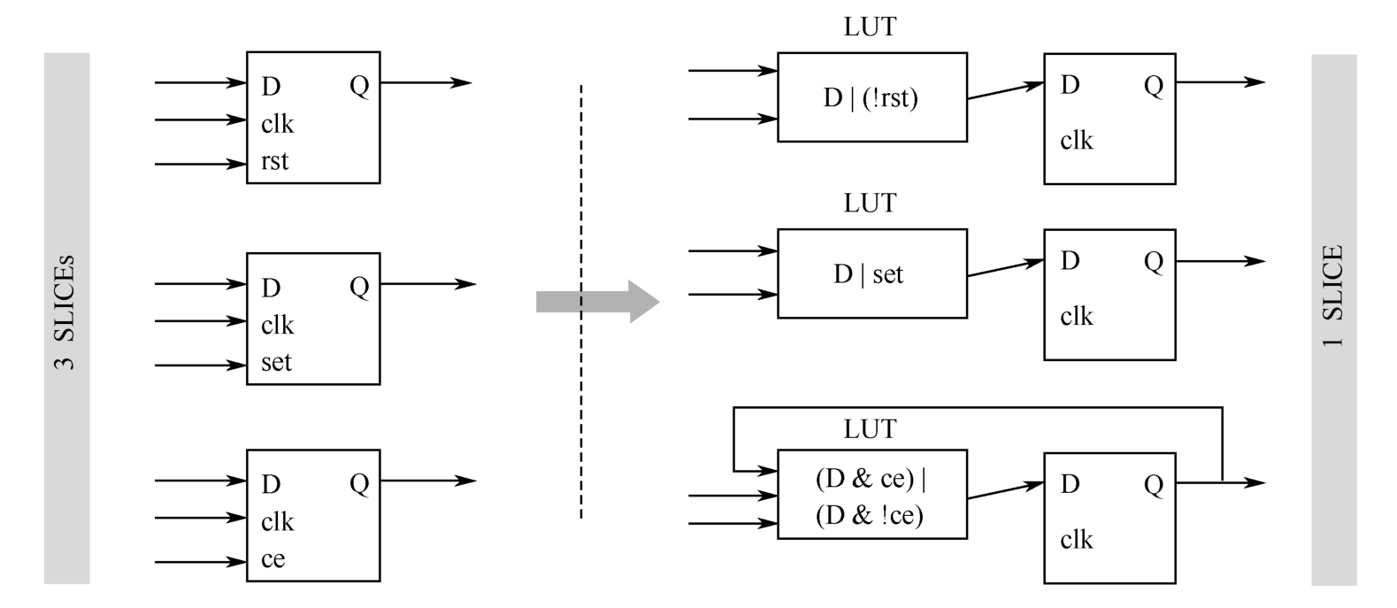 触发器的控制集由时钟信号、复位/置位信号和使能信号构成,通常只有{clk,set/rst,ce}均相同的触发器才可以被放置在一个SLICE中。但是,对于同步置位、同步复位和同步使能信号,Vivado会根据-control_set_opt_threshold的设置进行优化,其目的是减少控制集的个数。优化的方法如图2.16所示。在优化之前,3个触发器被分别放置在3个SLICE中,而优化后,被放置在一个SLICE中,但此时需占用查找表资源。