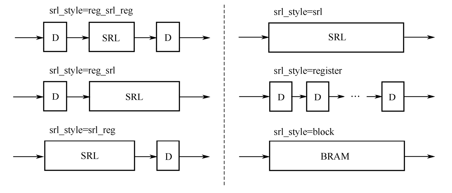 此外,综合属性srl_style可指导综合工具如何处理移位寄存器。它的6个可取值及对应的综合结果如图2.20所示。srl_style的优先级虽高于-shreg_min_size,低于shreg_extract,但srl_style不必与shreg_extract联合使用。