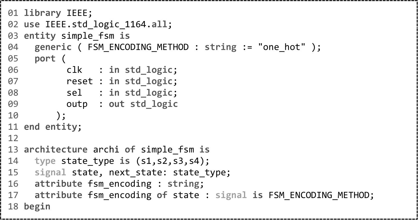 通常情况下,-fsm_extraction设定为auto即可满足设计需求,如果需要对某个状态机指定编码方式,可以采用VHDL代码2.1所示的方式,通过对fsm_encoding的参数化处理实现代码的高效维护和管理并增强代码的可读性。