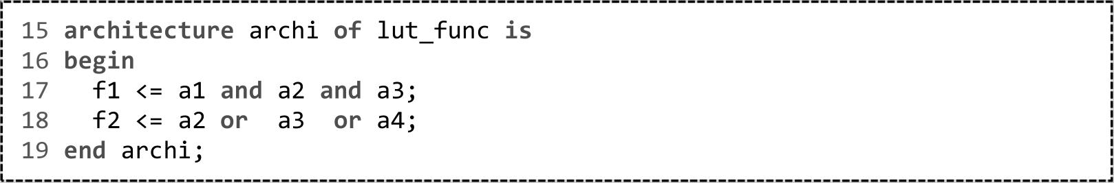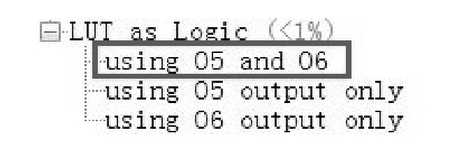 如VHDL代码2.7所示,在默认情况下会占用一个LUT6,即采用了LUT整合。在综合后的资源利用率报告中会显示消耗了一个LUT6。在实现后的报告中,选择图2.18中的using O5 and O6可查看整合的LUT6个数。