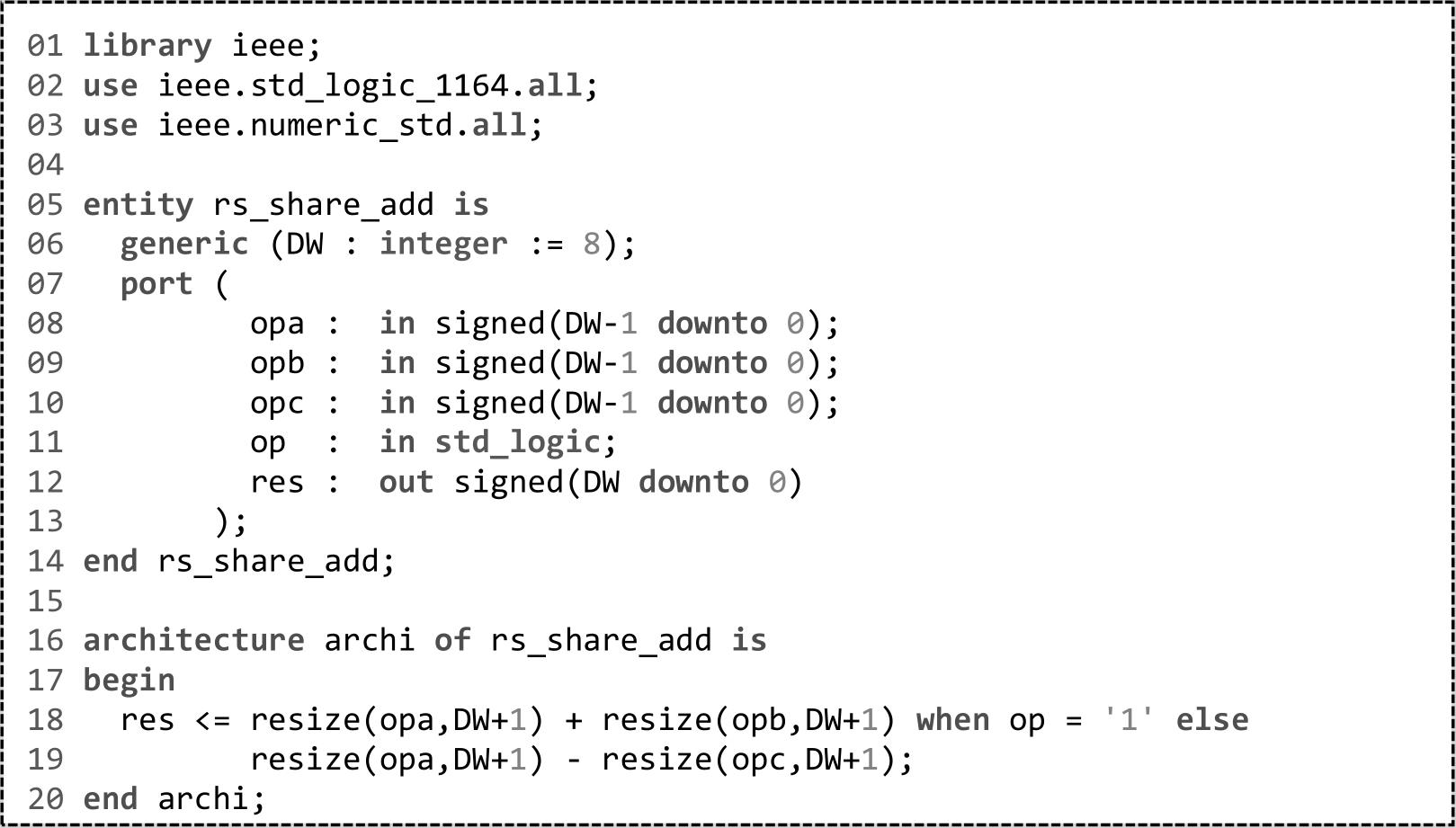 以加法运算为例,VHDL代码2.4显示了利用资源共享降低资源利用率。代码中resize函数的作用是对操作数进行符号位扩展,防止溢出。-resource_sharing分别为on和off时的资源利用率如图2.14所示,显然,资源共享降低了资源利用率。资源共享的原理如图2.15所示。