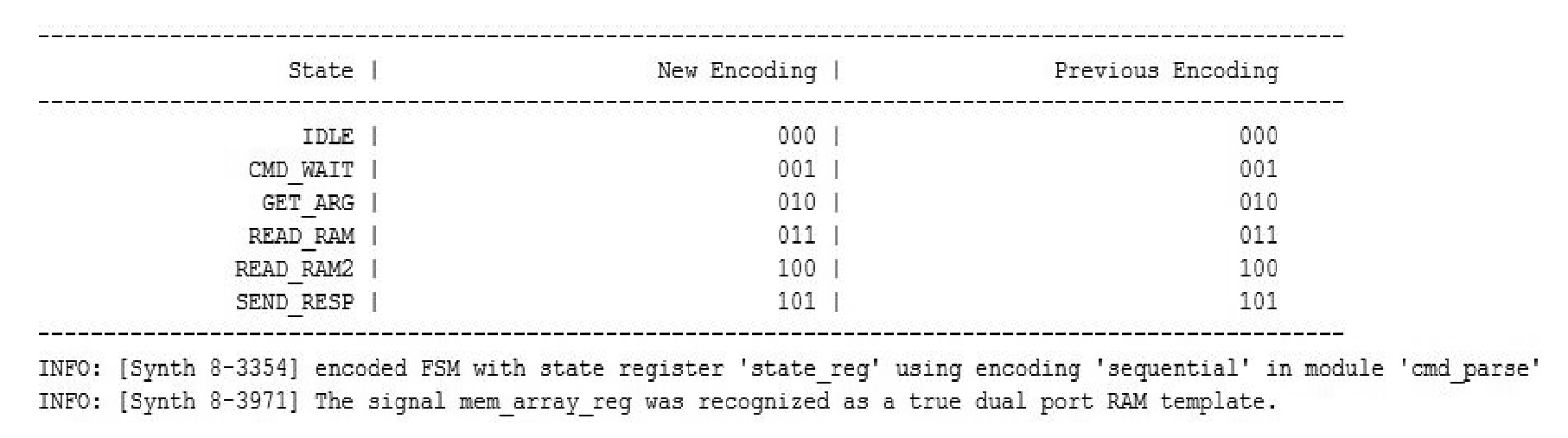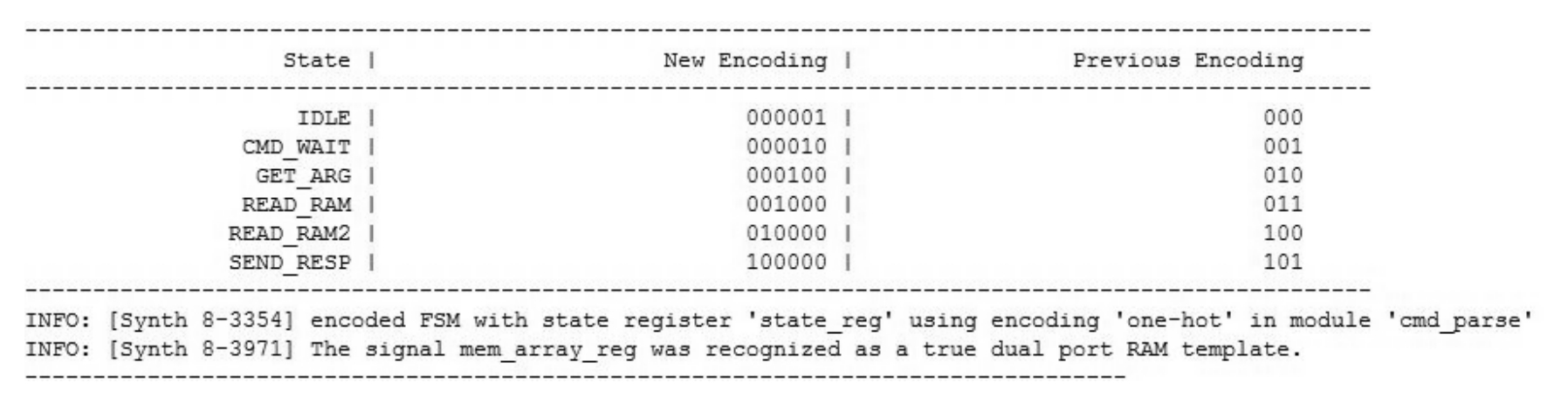 仍以Vivado自带的例子工程Wavegen为例,该工程的cmd_parse模块中包含一个状态机。当-fsm_extraction为auto时,综合后在log窗口中搜索encoding,结果如图2.9所示,可见此时状态机编码方式为sequential,之所以会显示Previous Encoding,是因为cmd_parse模块本身已经设定了编码方式,如图2.10所示。